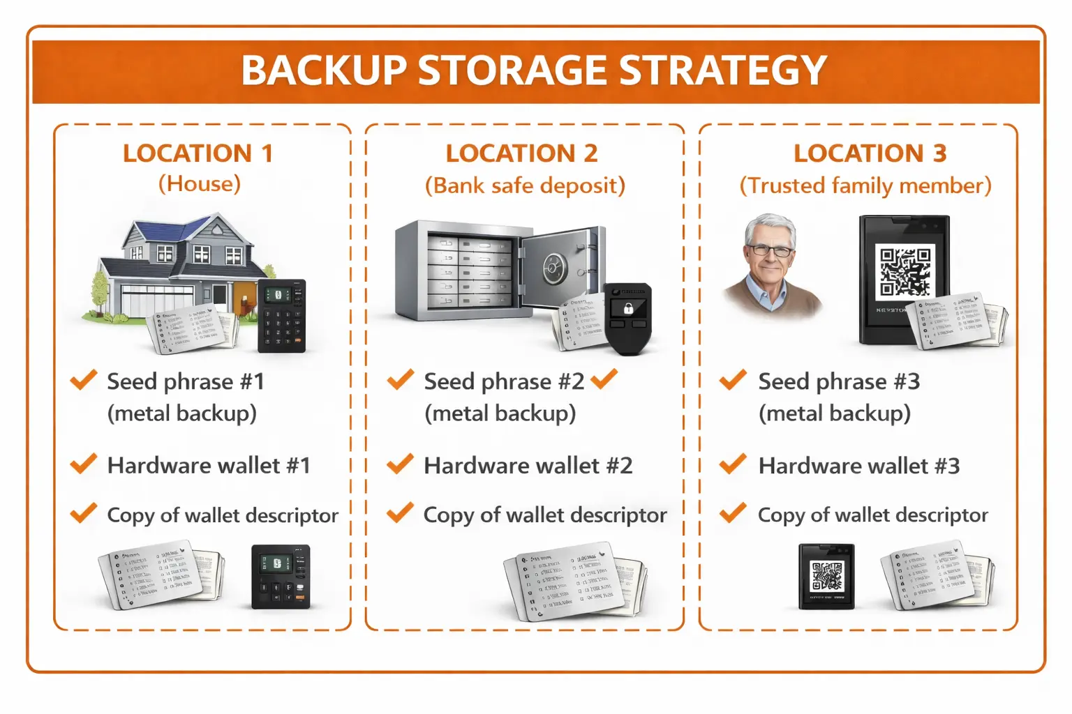 - Seed phrases are stored in separate physical locations